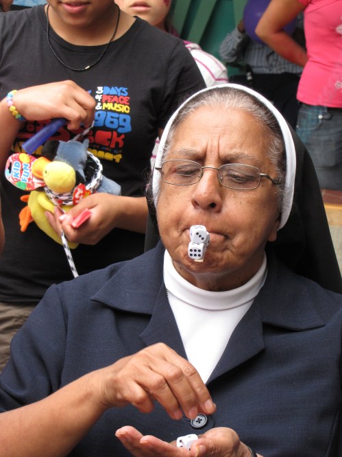Our final day had arrived and a special carnival is planned for the girls and elderly at the senior center. The courtyard is decorated with streamers and balloons. Carnival activities consisted of ring toss, cake walk, face painting, duck pond, fishing, and “Minute to Win it”. Popcorn was popped and drinks were served.