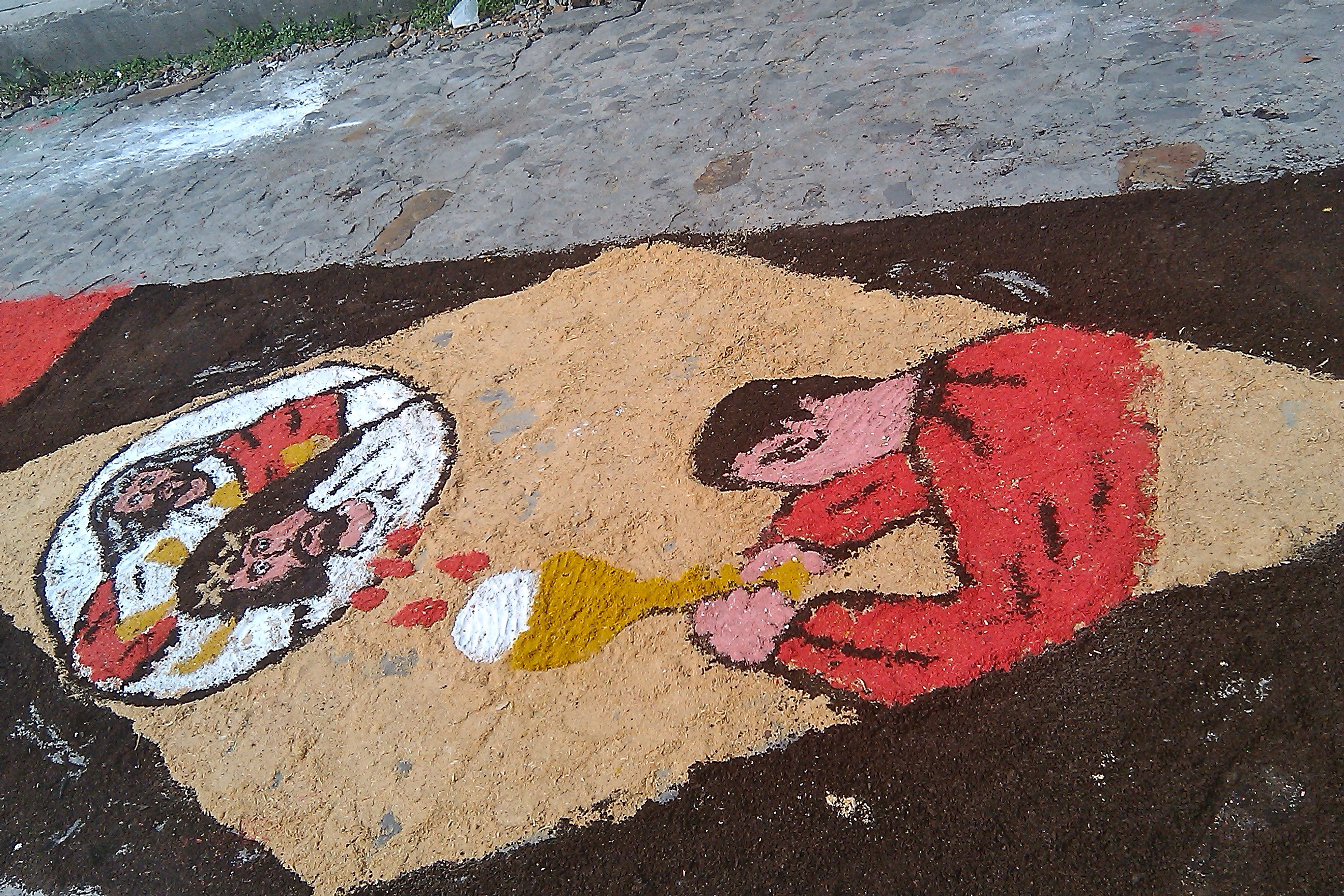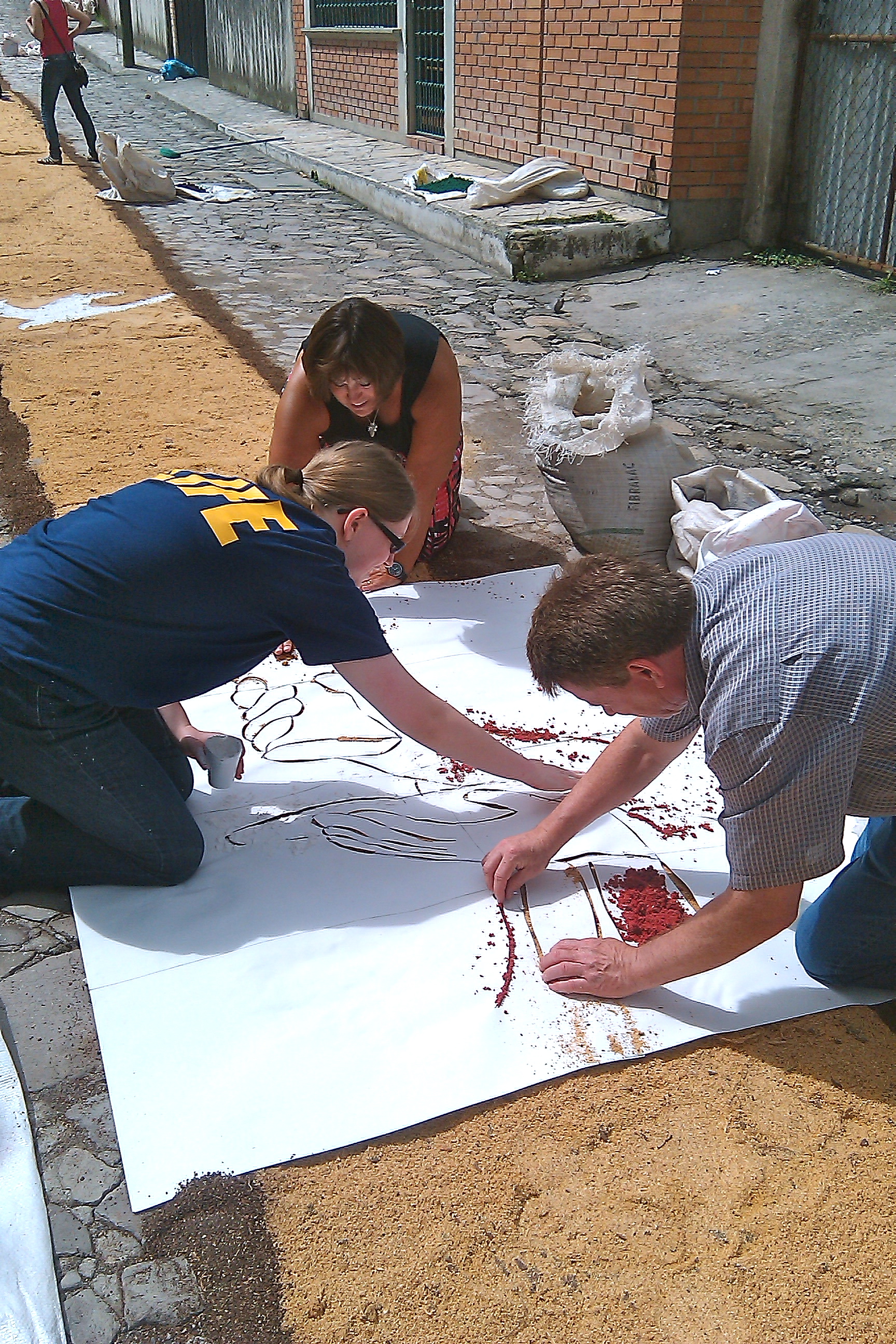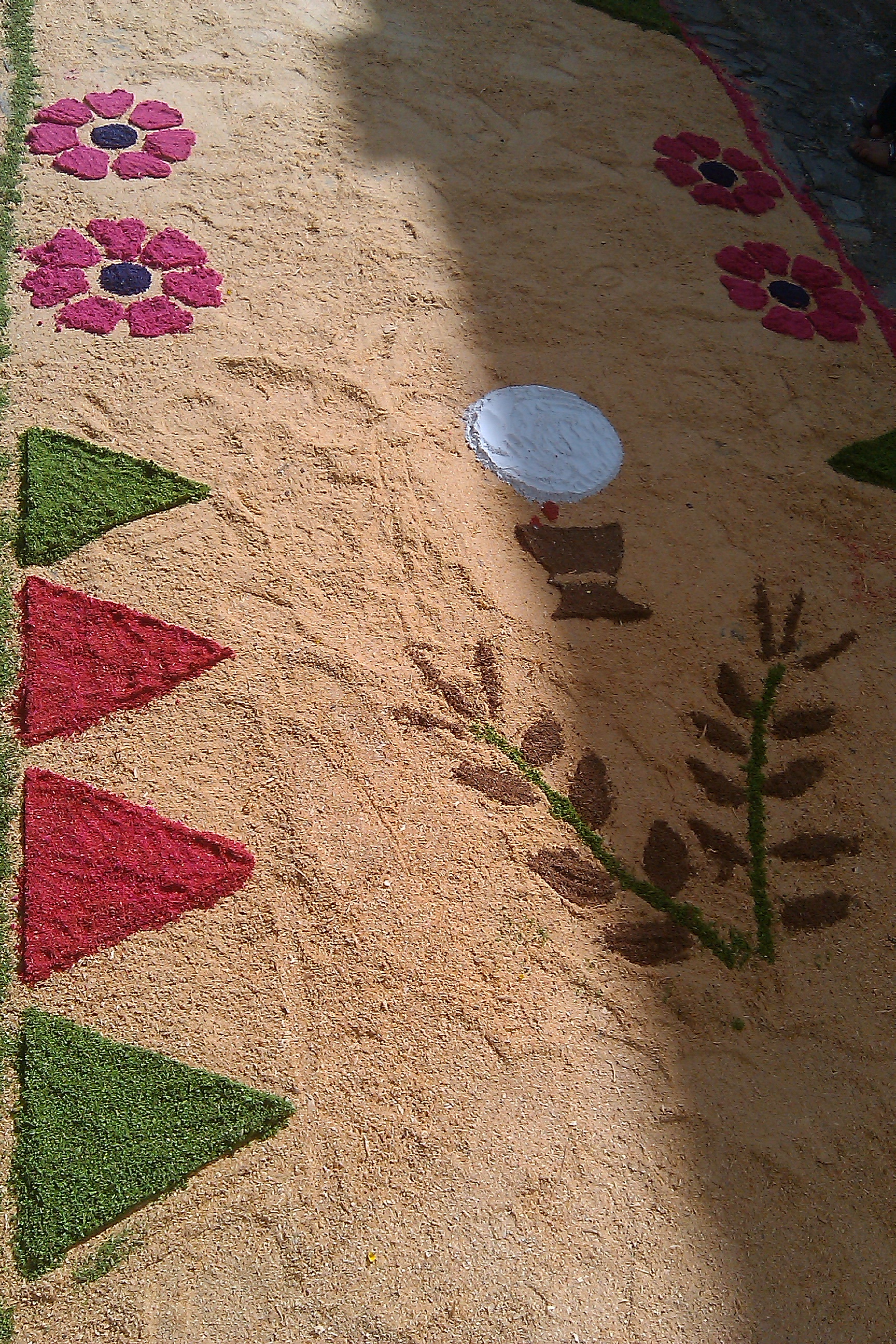 After breakfast at the elderly home we walked to the Cathedral with all the girls. After Mass the firecrackers began to celebrate Corpus Christi, they were LOUD!!  In further celebration, as we exited the Cathedral there were the traditional “rugs” or “carpet”. These are artistic creations done by the towns people. They are made of colored sawdust and the people begin creating their rugs at 2:00-3:00am. There is a lot of preparation for the rug. As the procession left the Cathedral, it walked through the carpets…it seemed a little sad to destroy the beauty. As we walked back to the elderly home we ran into a man Dani knew who was working on his rug. I asked if we could help and he let us try it…it was NOT as easy as it looks and it doesn’t look easy!!