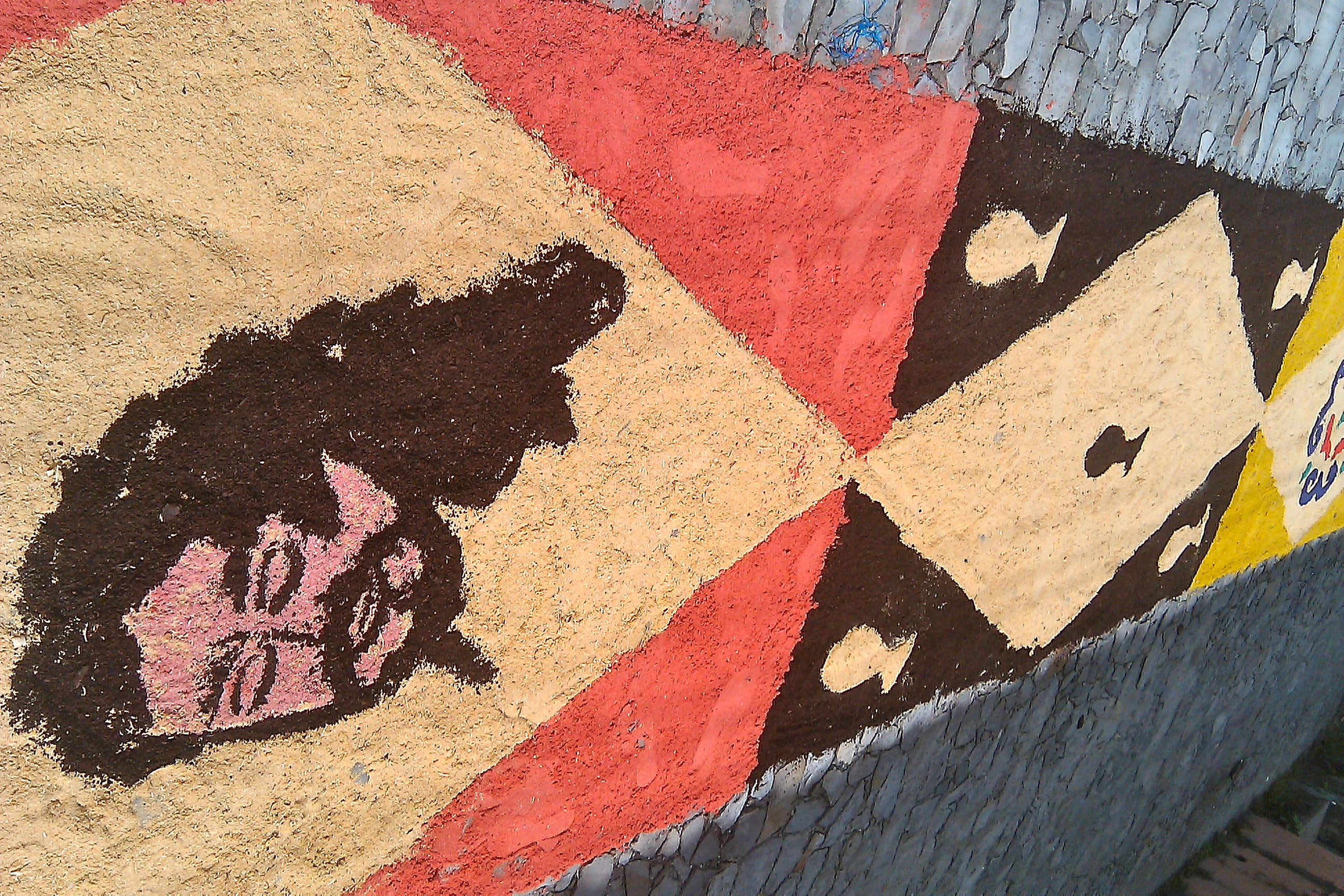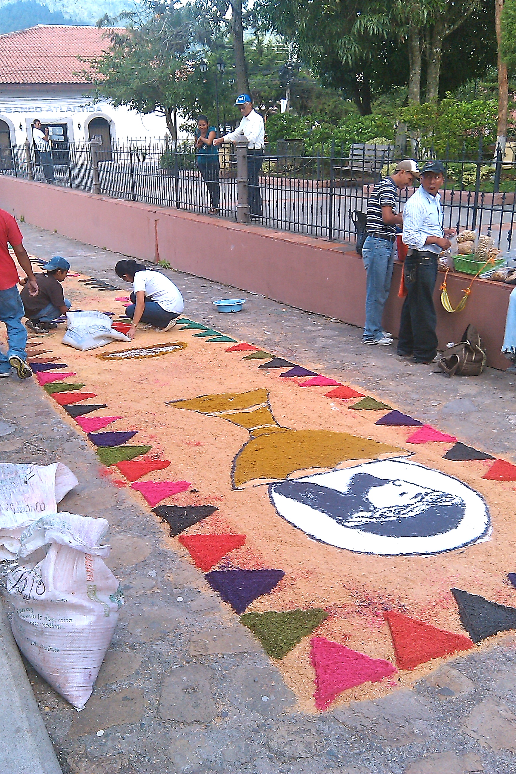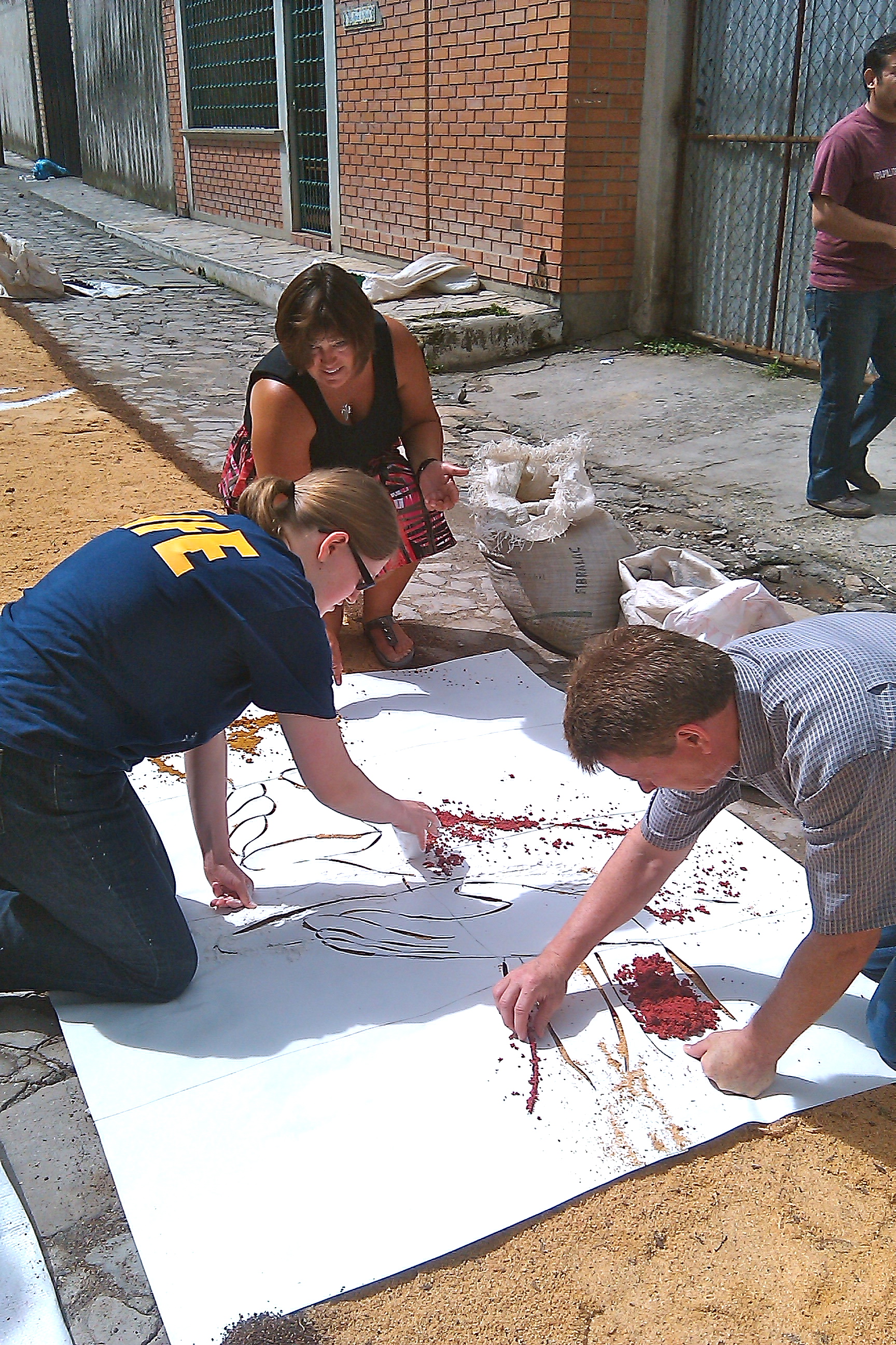 After breakfast at the elderly home we walked to the Cathedral with all the girls. After Mass the firecrackers began to celebrate Corpus Christi, they were LOUD!!  In further celebration, as we exited the Cathedral there were the traditional “rugs” or “carpet”. These are artistic creations done by the towns people. They are made of colored sawdust and the people begin creating their rugs at 2:00-3:00am. There is a lot of preparation for the rug. As the procession left the Cathedral, it walked through the carpets…it seemed a little sad to destroy the beauty. As we walked back to the elderly home we ran into a man Dani knew who was working on his rug. I asked if we could help and he let us try it…it was NOT as easy as it looks and it doesn’t look easy!!