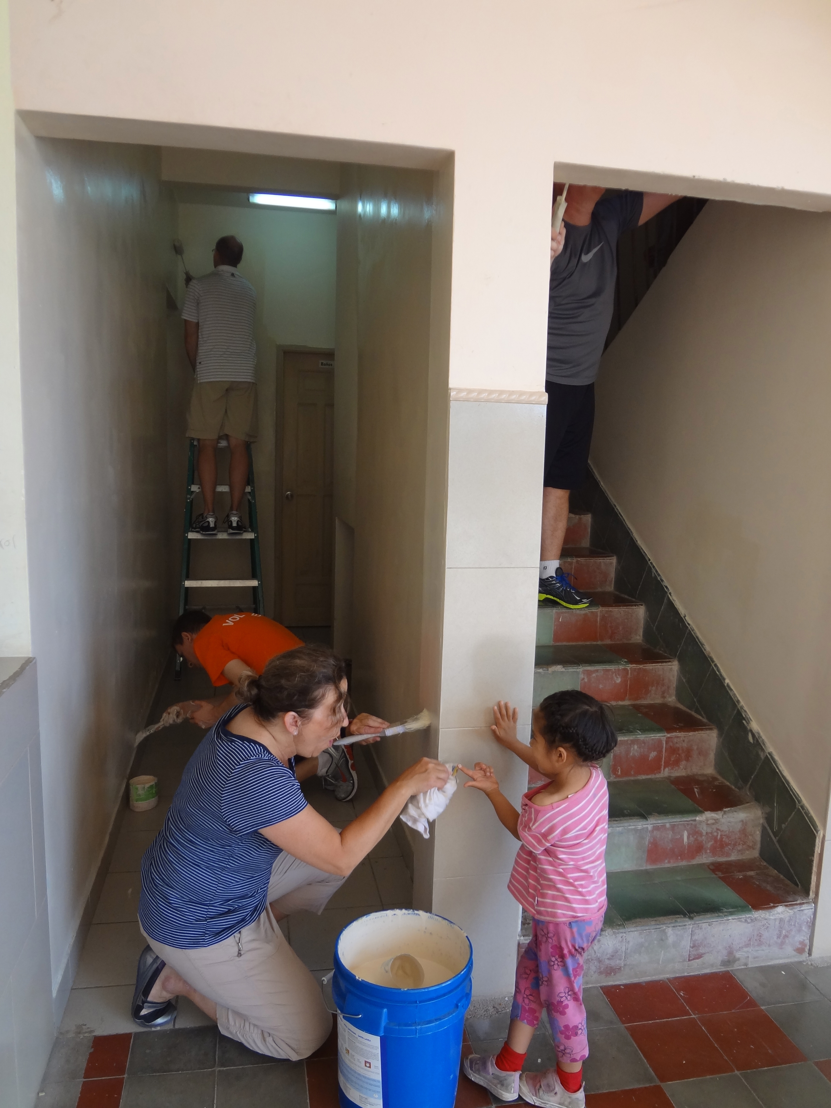 The rest of the afternoon Greg, David, Justin, Barbara and Jane spent painting the hallway and stairway walls. Considering there are anywhere from 47-54 girls living in the orphanage at any one time, normal wear and tear is expected. They take very good care of the daily maintenance. While most of the team was painting, Barb and Lynn conducted their first book club meetings. Barb is working with the younger girls “Chicas” reading Clementine and Lynn is working with the pre-teen/teenagers “Diamantes” and “Perlas” reading The Mouse and the Motorcycle. Discussions were translated by Dani. The groups will meet again on Saturday for more discussion and activities. After our work we were all rewarded with game time. The girls enjoyed Jenga, Twister, Blink and other games.