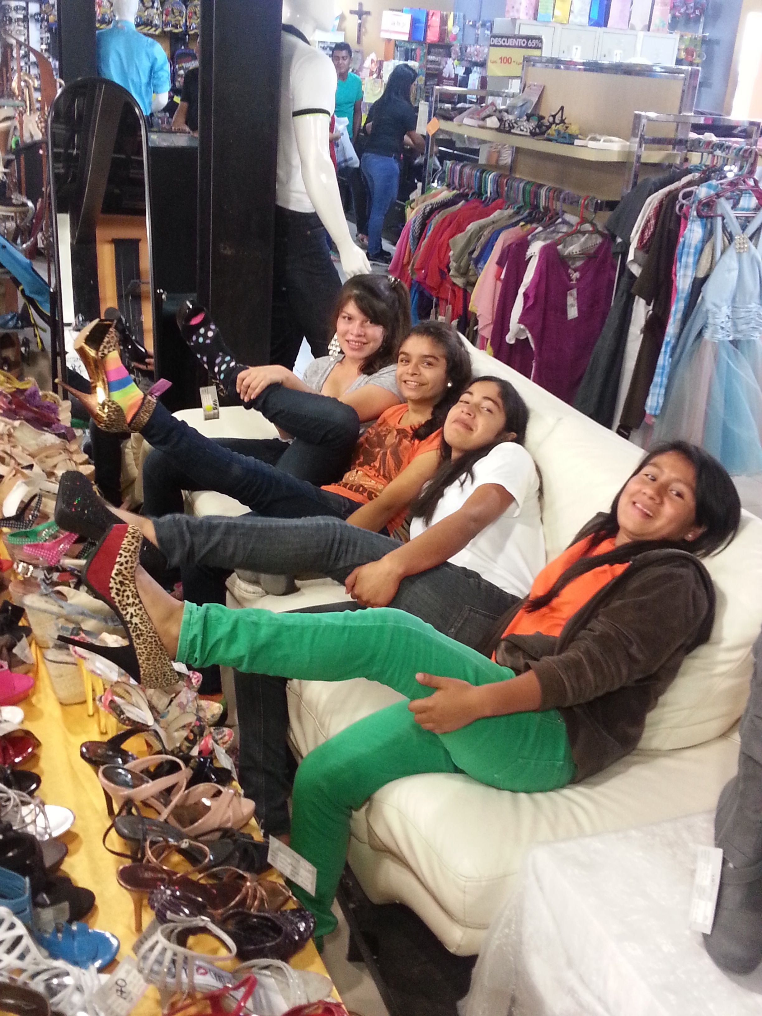 Later in the afternoon, the girls shopped in the clothing boutique for jeans and sweatshirts, each could pick out one of each item. The four girls celebrating their quinceanera: Juana, Karen, Ermelinda, and Estefani went into town with Meredith and Rose to shop. They were in the hunt for Converse style shoes–no luck! We shopped for close to four hours and hit nearly a dozen stores. The girls tried on lots of things, but were very diligent and thrifty with their money. In the end, they purchased jeans, watches, socks, and a few snacks. Everyone had a little money left over to save for a later time.