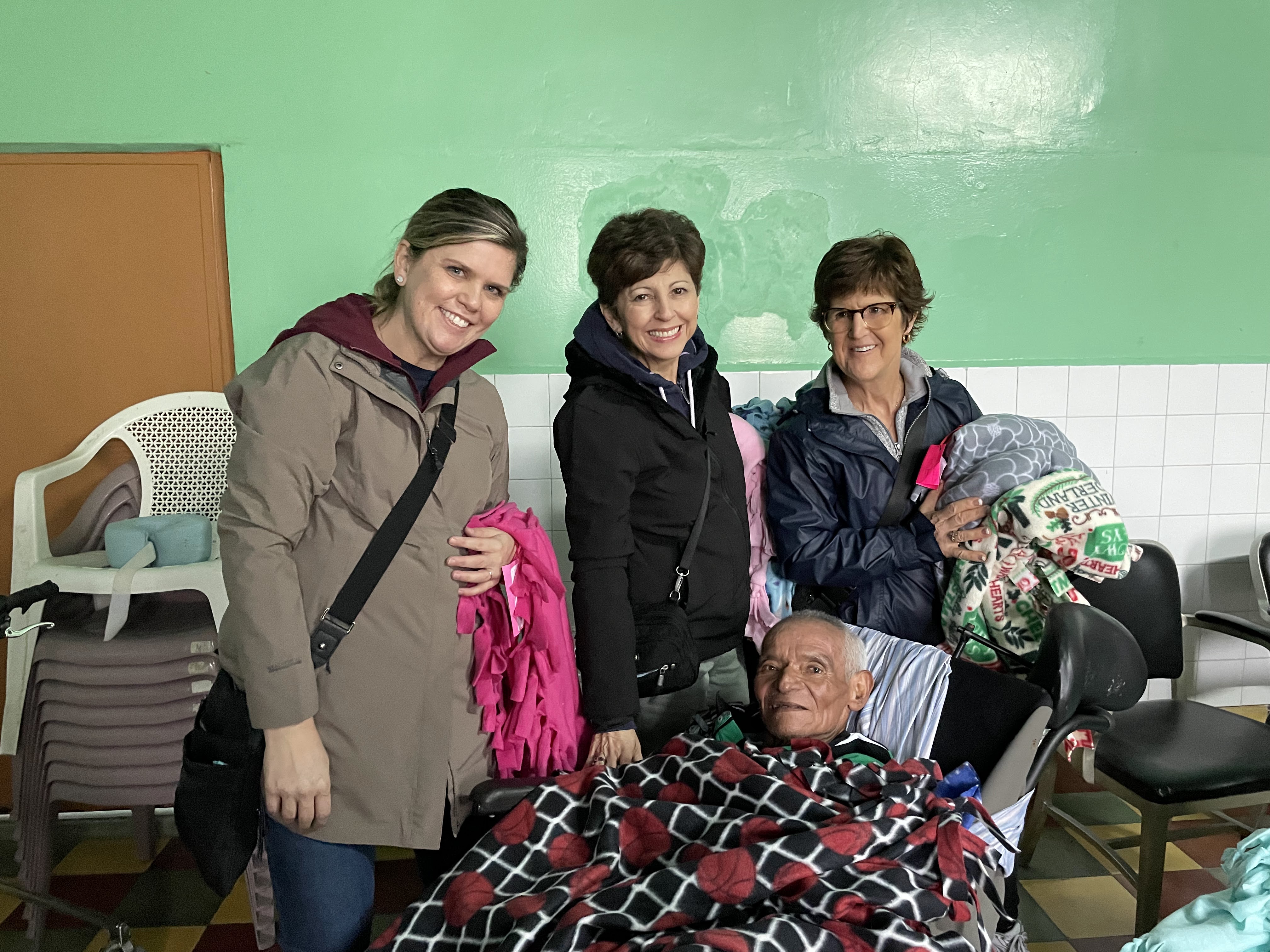 It was a damp and chilly day and the elderly had no interest in spending time in the outdoor courtyard. It was a perfect time to distribute the blankets that the SMA school children had made for them. They were so happy to receive such a bright and useful gift. The rest of the morning was spent visiting with them indoors, of course. The Jovenes helped us serve them the pizza we had ordered and again they were delighted to have this special treat. They devoured the pizza with gusto (pleasure)!