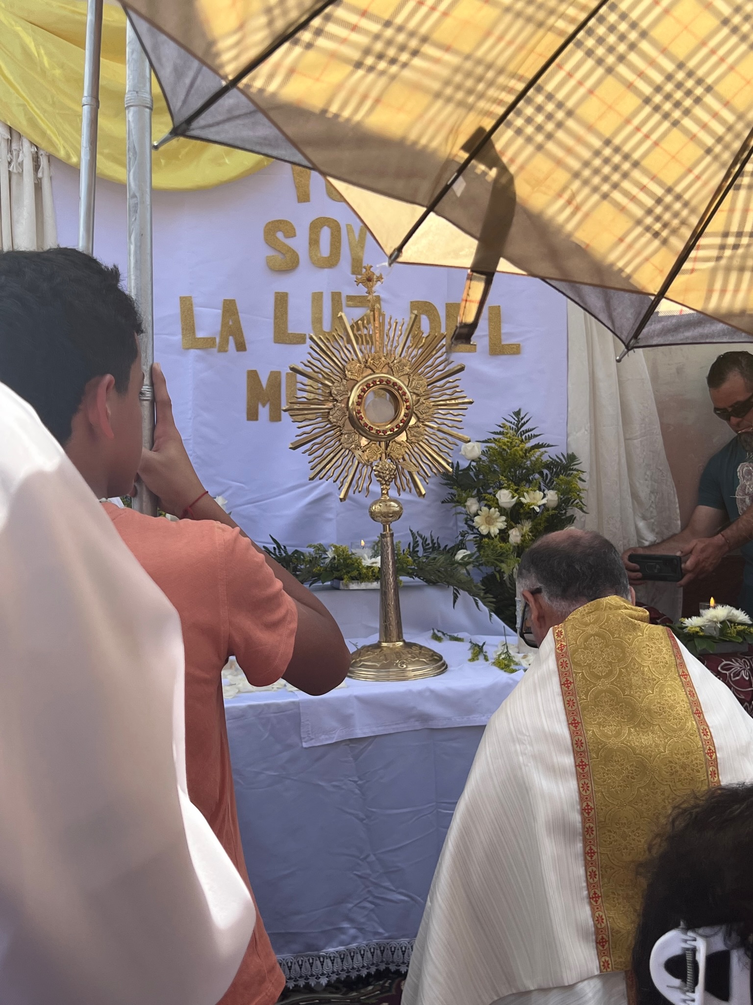 After a nice breakfast with the Sors we headed out to the Corpus Christi procession. The procession went from the Cathedral to the auditorium. There were store fronts that had altars prepared for the Monstrance and Eucharist to pass by. At each place the bishop stopped and placed the monstrance on the makeshift altar and readings were read, prayers were said and singing concluded each adoration site. We ended the procession at the auditorium with Mass and more beautiful music.